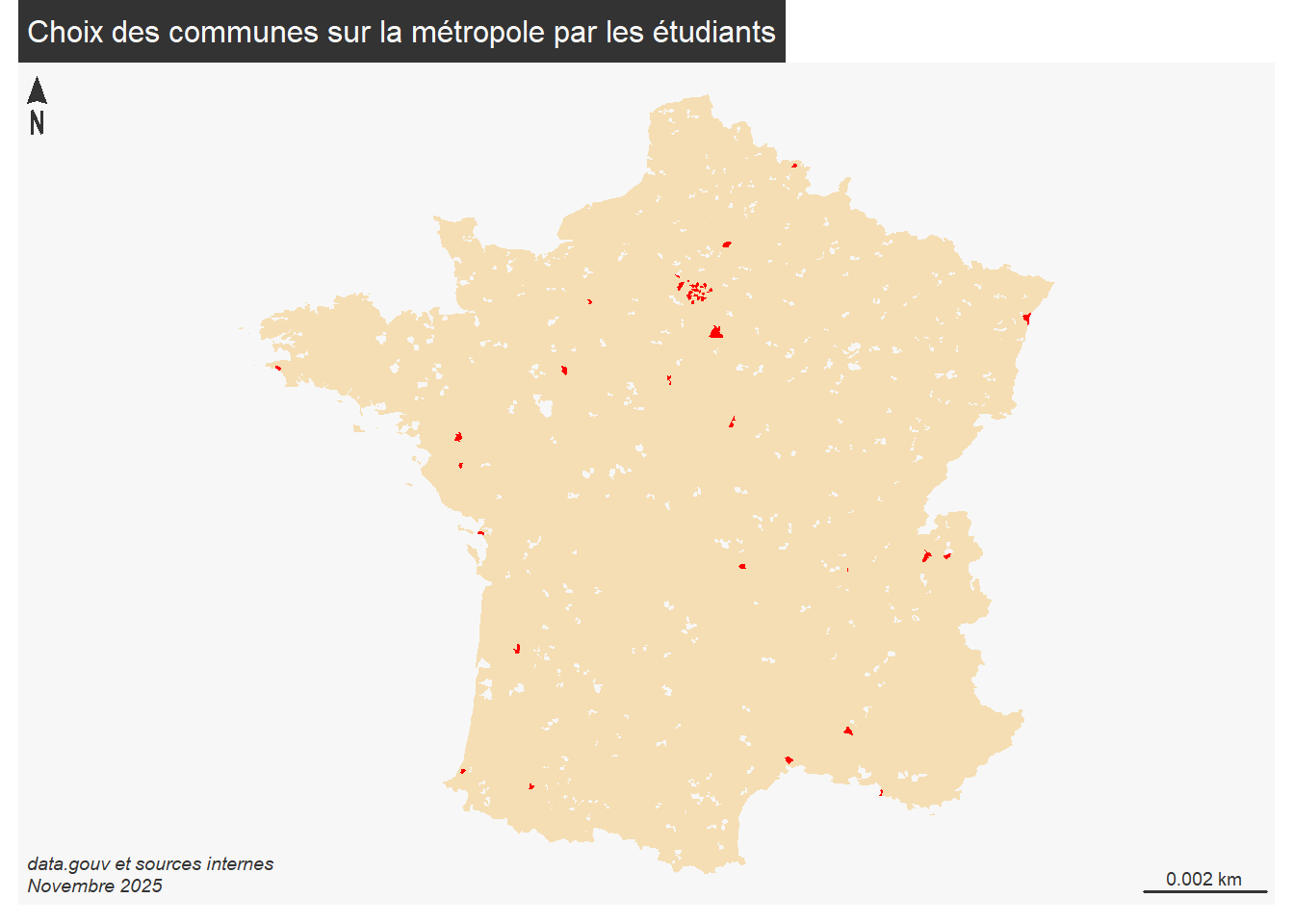 mf_layout("Choix des communes sur la métropole par les étudiants", "data.gouv et sources internes\nNovembre 2025")