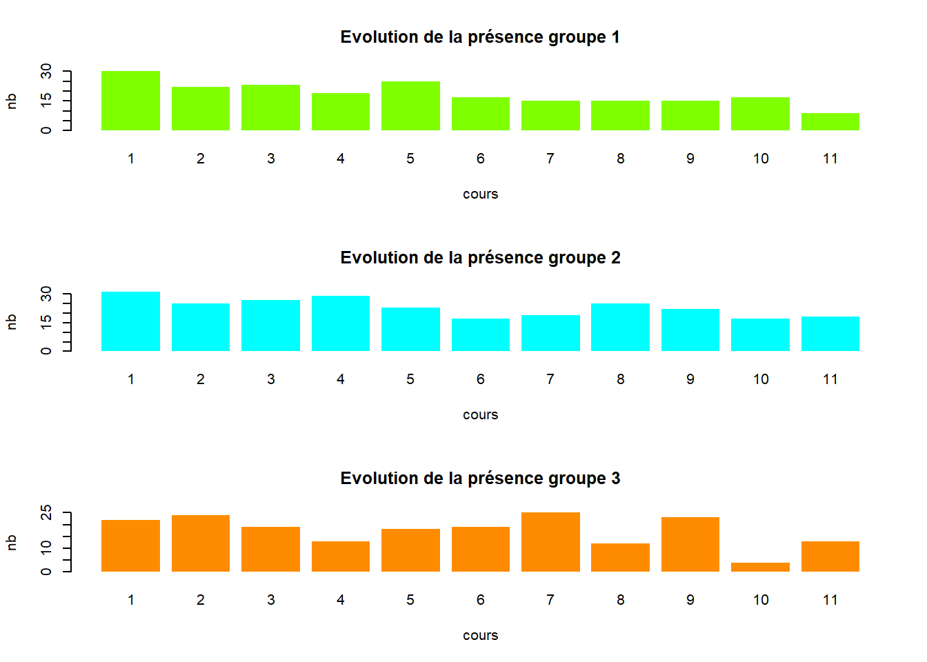 barplot(presence$TD3~presence$numCours, col="darkorange",beside = T, main = "Evolution de la présence groupe 3", xlab = "cours", ylab = "nb"
