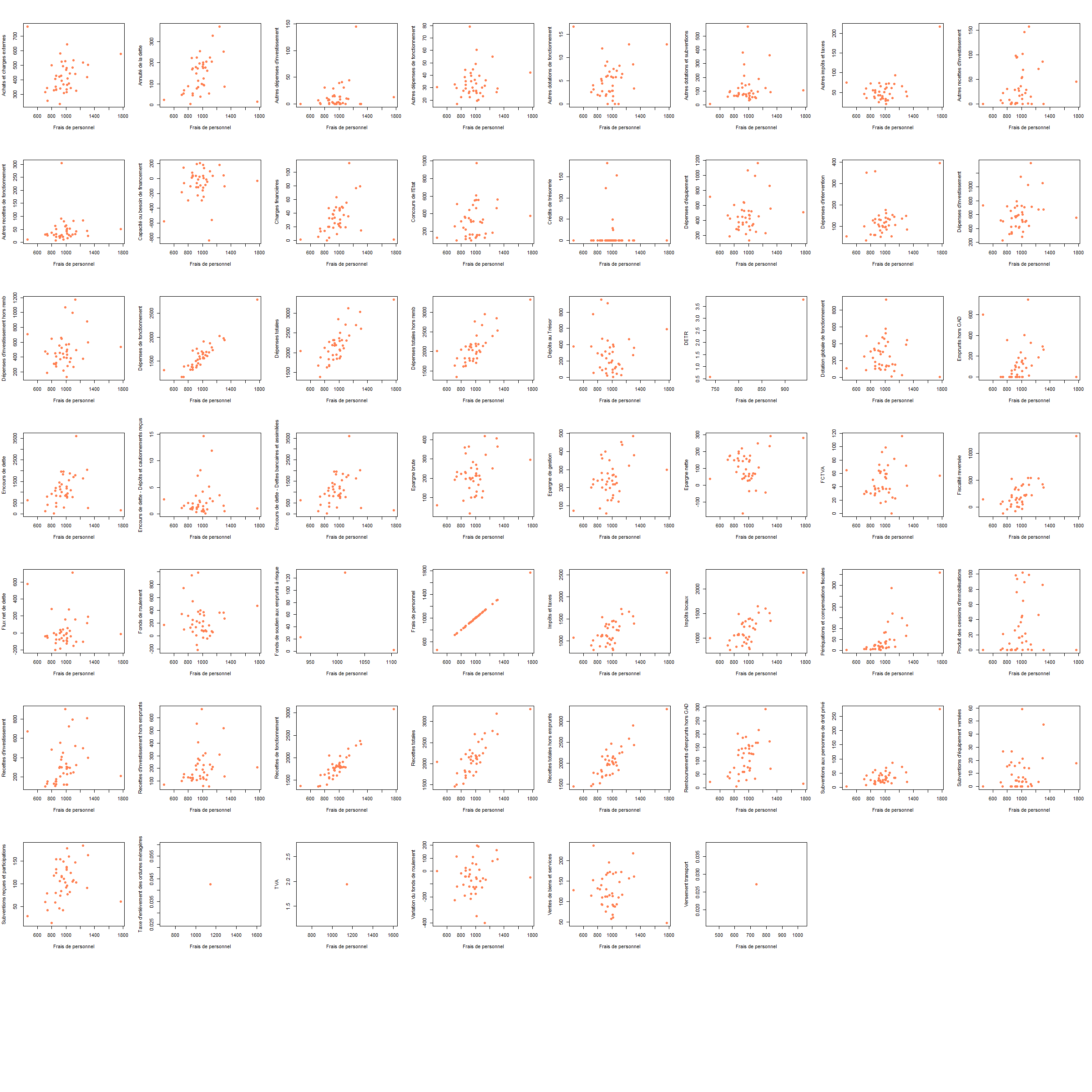 plot(jointure$Montant.en...par.habitant.y,jointure$Montant.en...par.habitant.x, xlab = "Frais de personnel", ylab = n, col="coral", pch = 16)