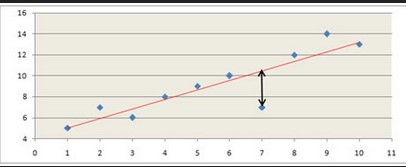 La droite de régression minimise la somme des carrés des distances verticales entre chacun des points du nuage et la droite recherchée.