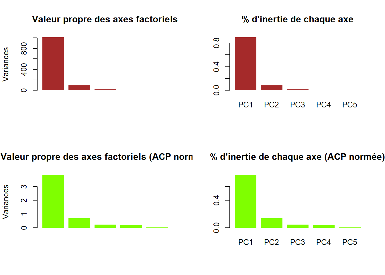 plot(res2, "Valeur propre des axes factoriels (ACP normée)", col="chartreuse", border= NA)
