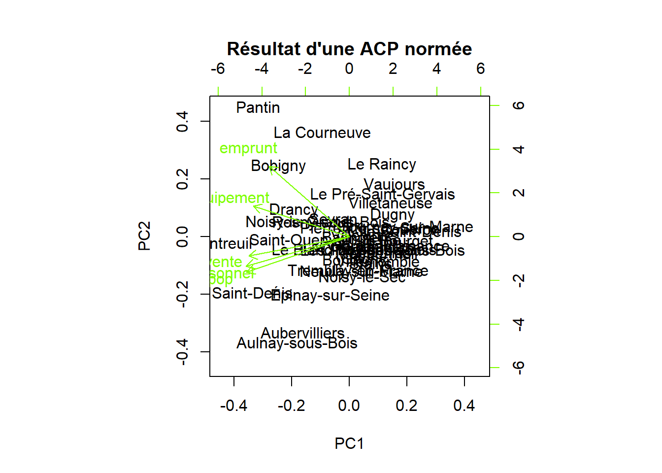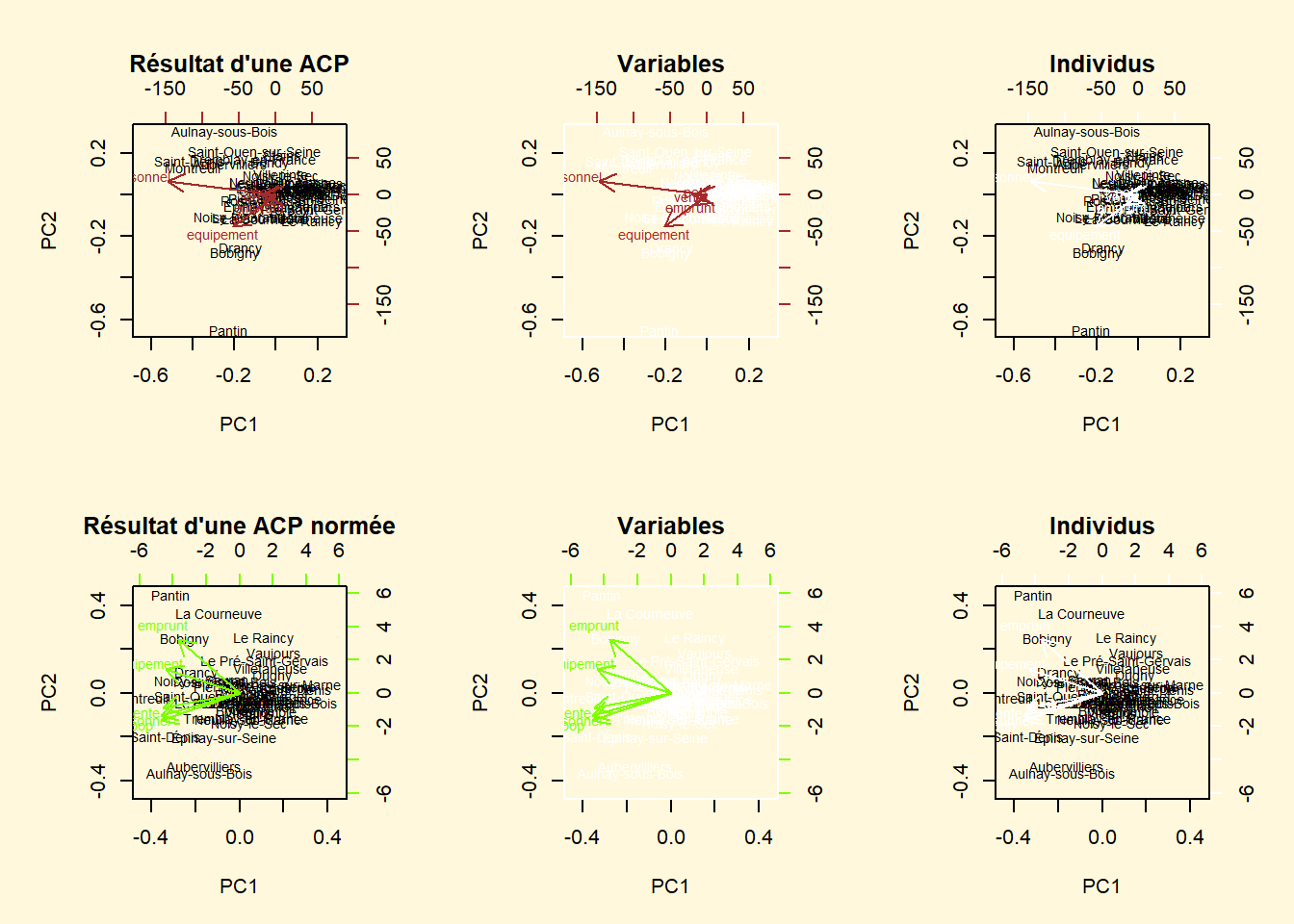 Dans notre cas, l’ACP non normée permet de voir qu’équipement et personnel sont les 2 variables les mieux représentées, mais c’est omettre la population qui n’a pas du tout la même unité que les données financières.